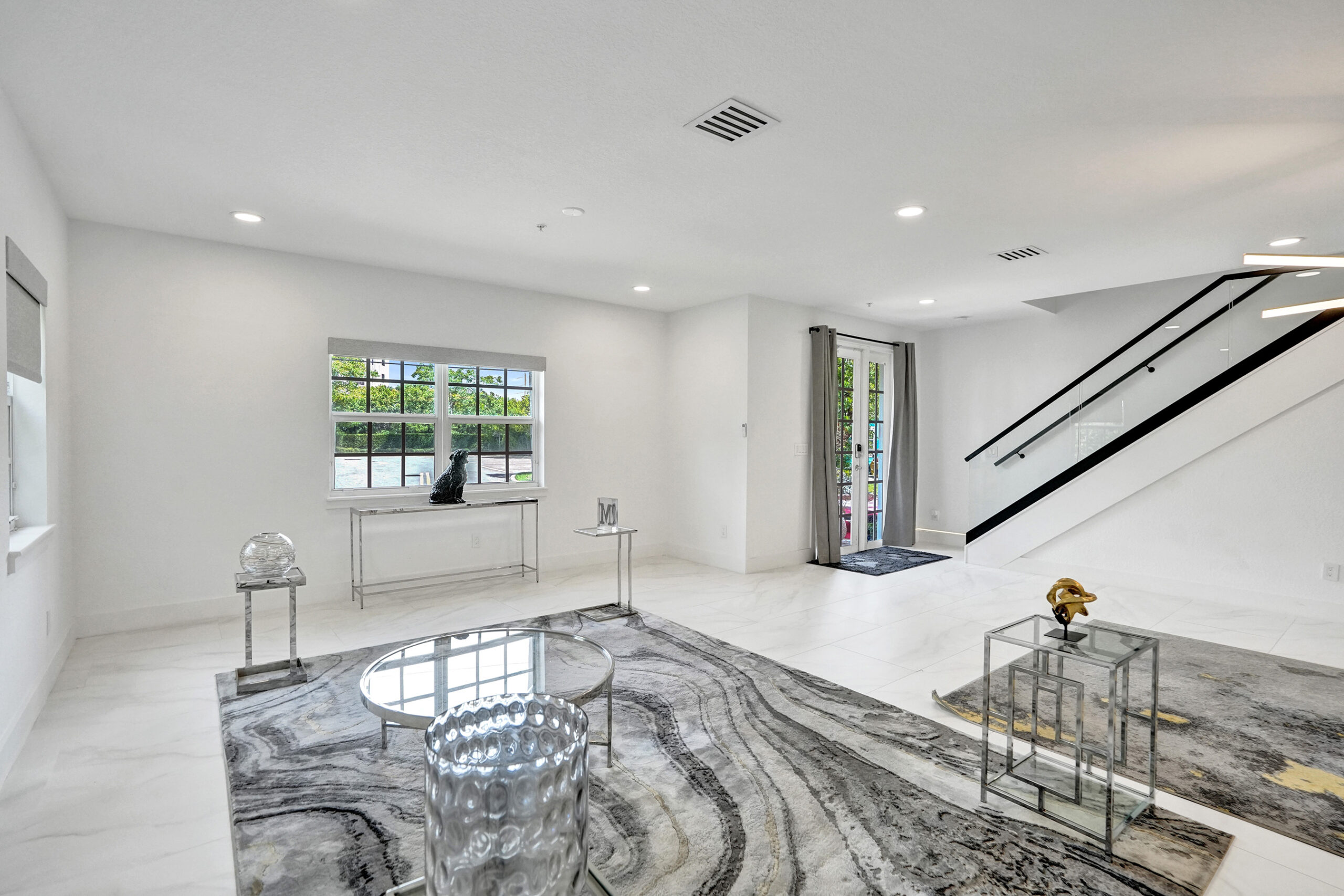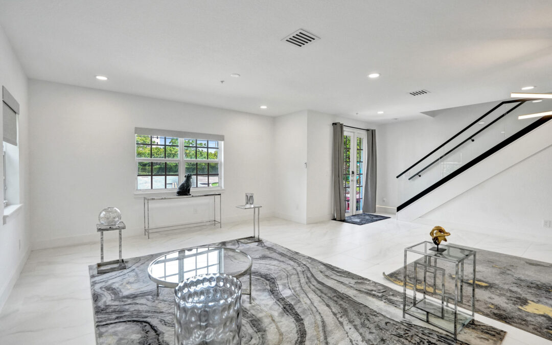 Bright, open-concept living room with sleek glass staircase, porcelain tile floors, and modern finishes in this Wilton Manors townhome.