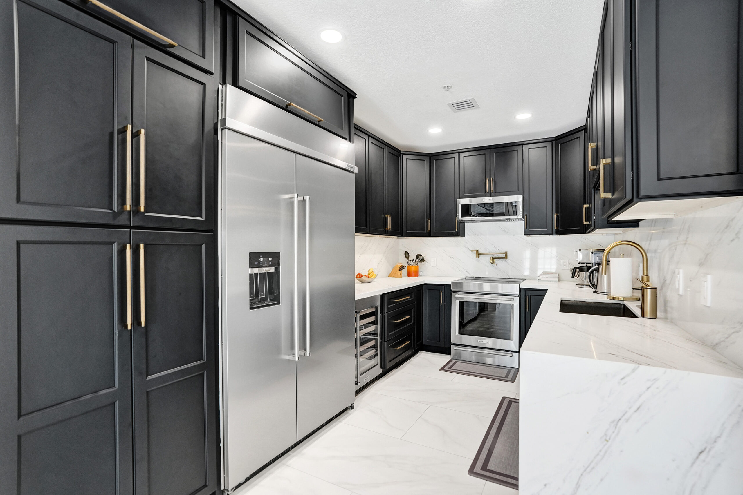 Luxury kitchen with custom black cabinets, quartz counters, and stainless steel appliances in Unit A, Wilton Manors.